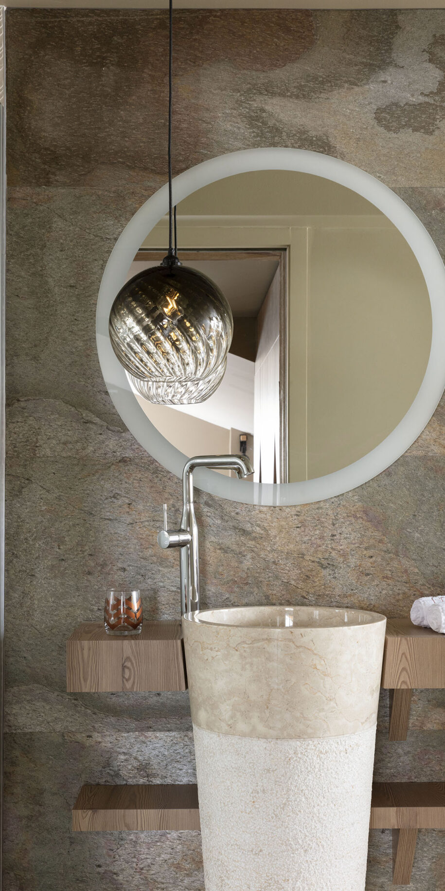 - Surfaces intérieures : Plans de travail, crédences, salles de bains et sols en pierre naturelle.