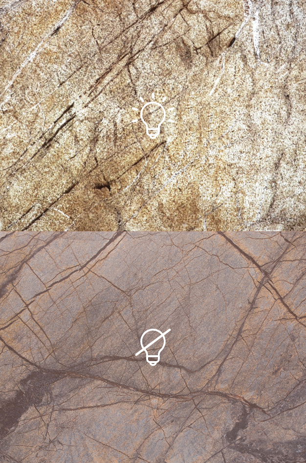 - Effets lumineux spectaculaires : La lumière traverse la pierre grâce à son verso translucide, sublimant ses nuances et son veinage.